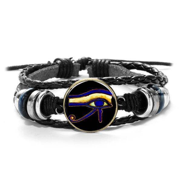 An Egyptian lucky bracelet decorated with an eye of Ra. To distinguish an "eye of Ra, symbol of the creation" from an "eye of Horus, symbol of the clairvoyant vision", we need to remember that the eye of Ra is the right eye of the face while the eye of Horus is the left eye of the face.