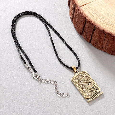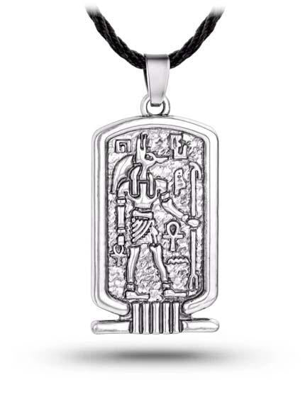 An Egyptian cartouche necklace representing the jackal god Anubis. Attentive eyes will certainly spot on this cartridge the "Maat feather", the "Was scepter" and the "cross of life ankh".