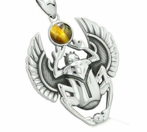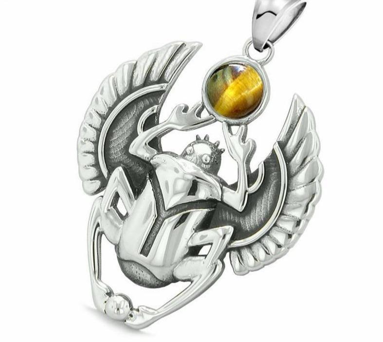 This steel "winged scarab necklace" represents a winged scarab of ancient Egypt. Surprisingly, by their activity of moving clods of earth in a "rolling snowball" fashion to find their food, winged scarabs were described as "living symbols of the creation of the cosmos".