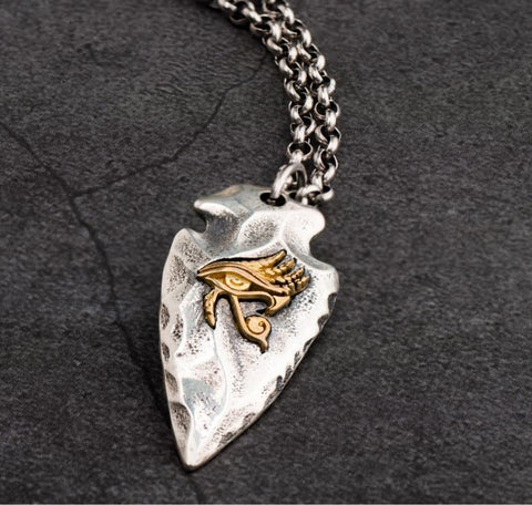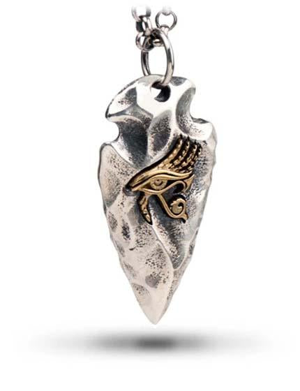 A silver Egyptian stone necklace decorated with the symbol of the ability to see "what-is-hidden": the eye of Horus.