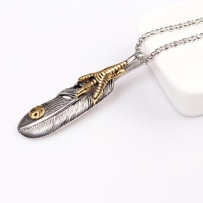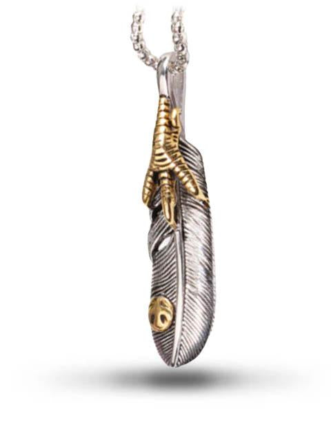 A steel Egyptian necklace "gold falcon feather" which obviously refer to the Egyptian god of "the sky" and of "the power of the pharaohs over the lands of Upper and Lower Egypt": the falcon-headed god Horus.