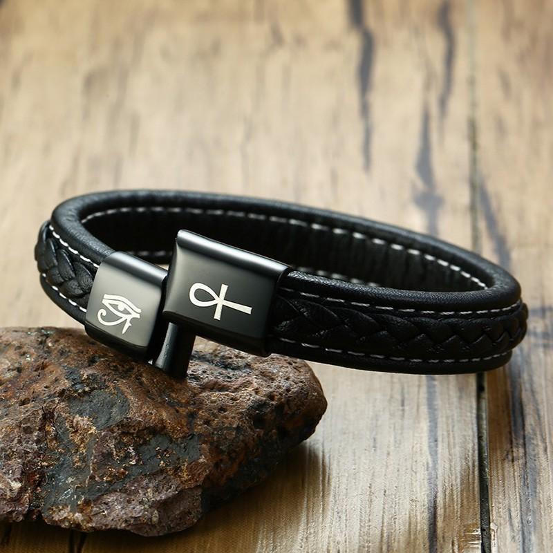 An ankh bracelet and an eye of Horus bracelet having been joined together to create a "Double Symbol" wrist bracelet.