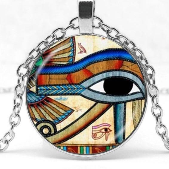 An Egyptian necklace "third eye of Ra" which refers to the symbol of the daylight in ancient Egypt: the eye of the falcon-headed Sun god Amun-Ra.
